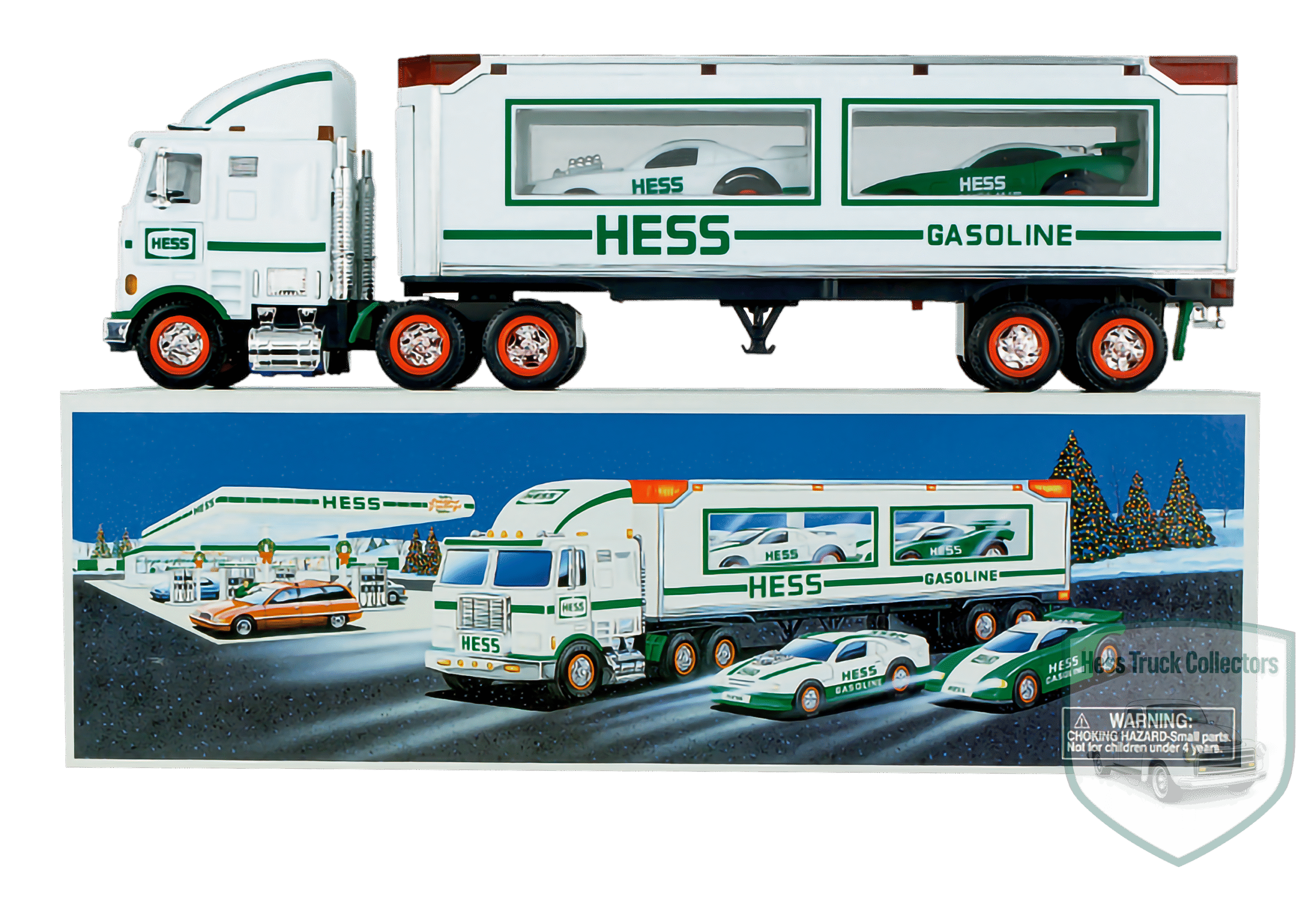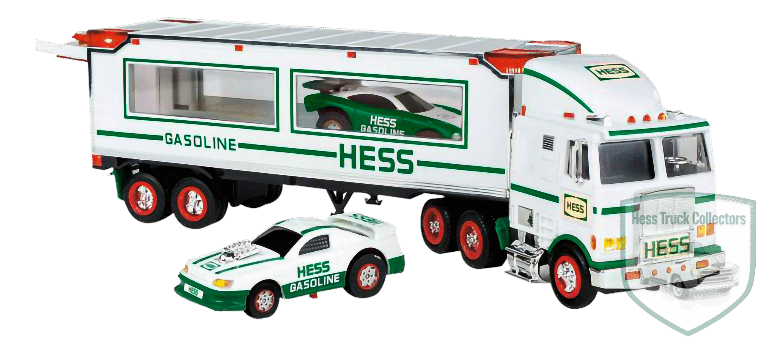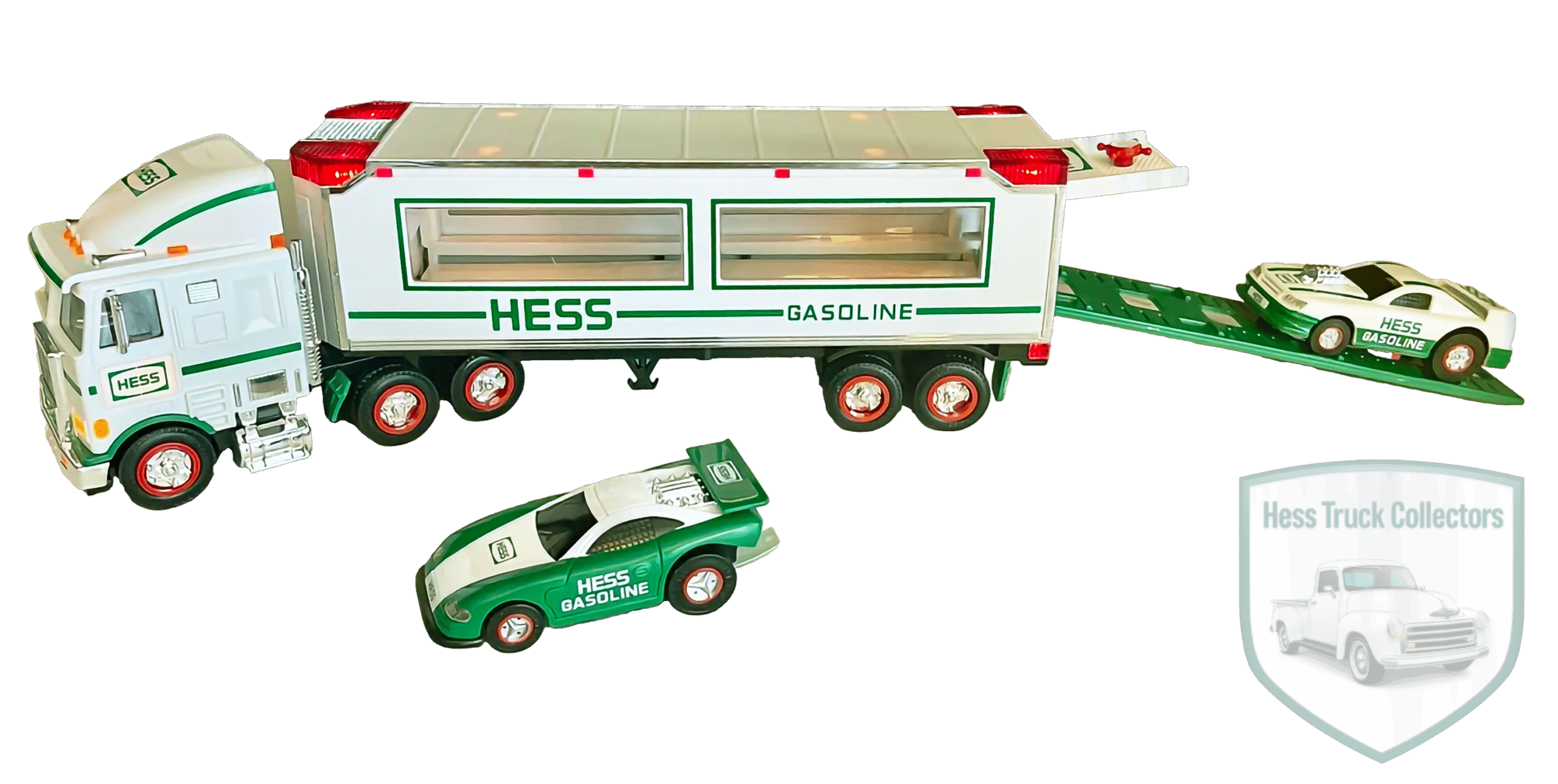 • Model: Box Trailer (Car Transporter) with Two Racers. This was Hess’s first official “3-toys-in-1” model.