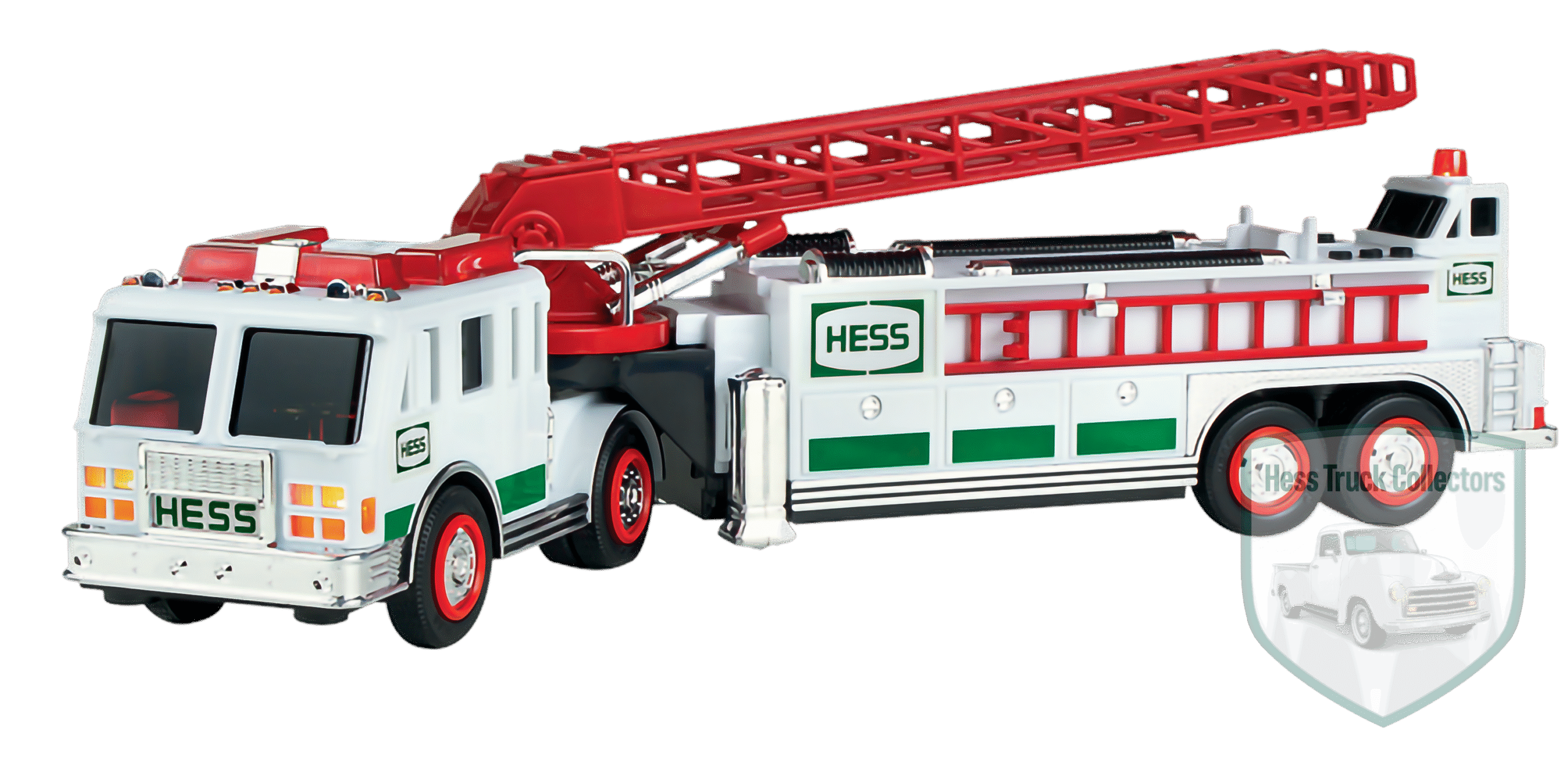 - Color Scheme: White cab and body with dark green striping and chrome detailing. The aerial ladder is Red.