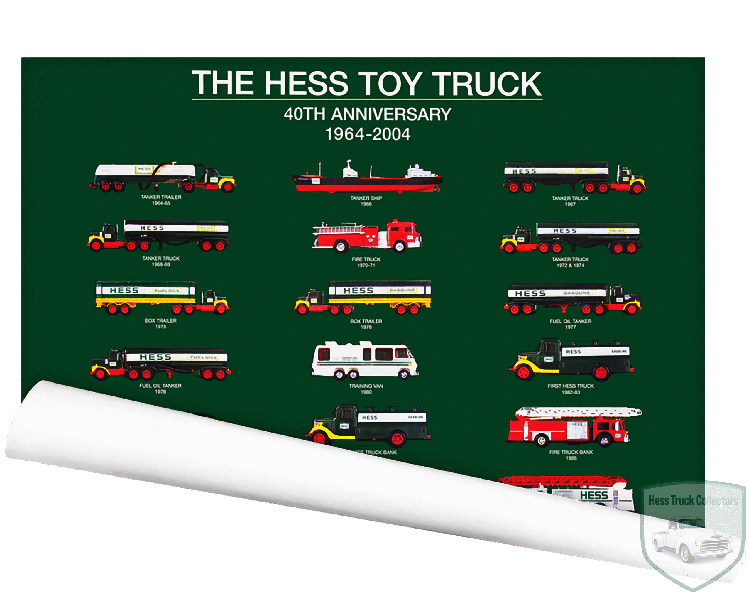 The 2004 40th Anniversary Collectible Poster was a unique Surprise Release merchandise item issued in honor of the 40th year of the Hess Toy Truck tradition. This poster served as a retrospective, celebrating the entire history of the collection up to that point.