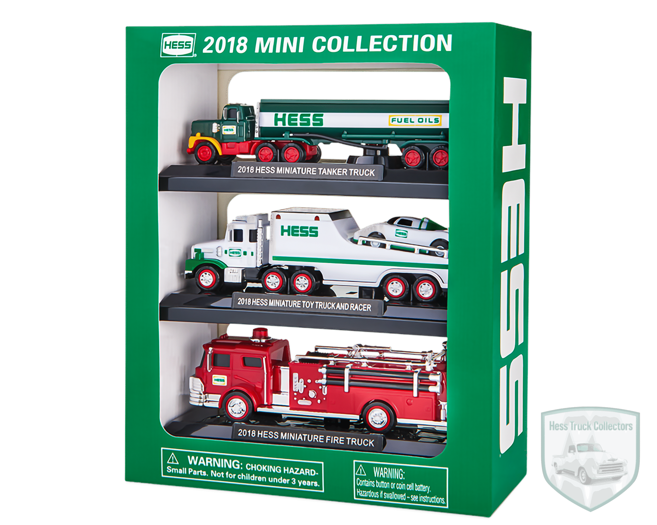The 2018 collection marked the anniversary by featuring highly detailed, small-scale replicas of some of the most memorable early Hess toys. The set was sold in a single package containing three individually detailed Mini vehicles.