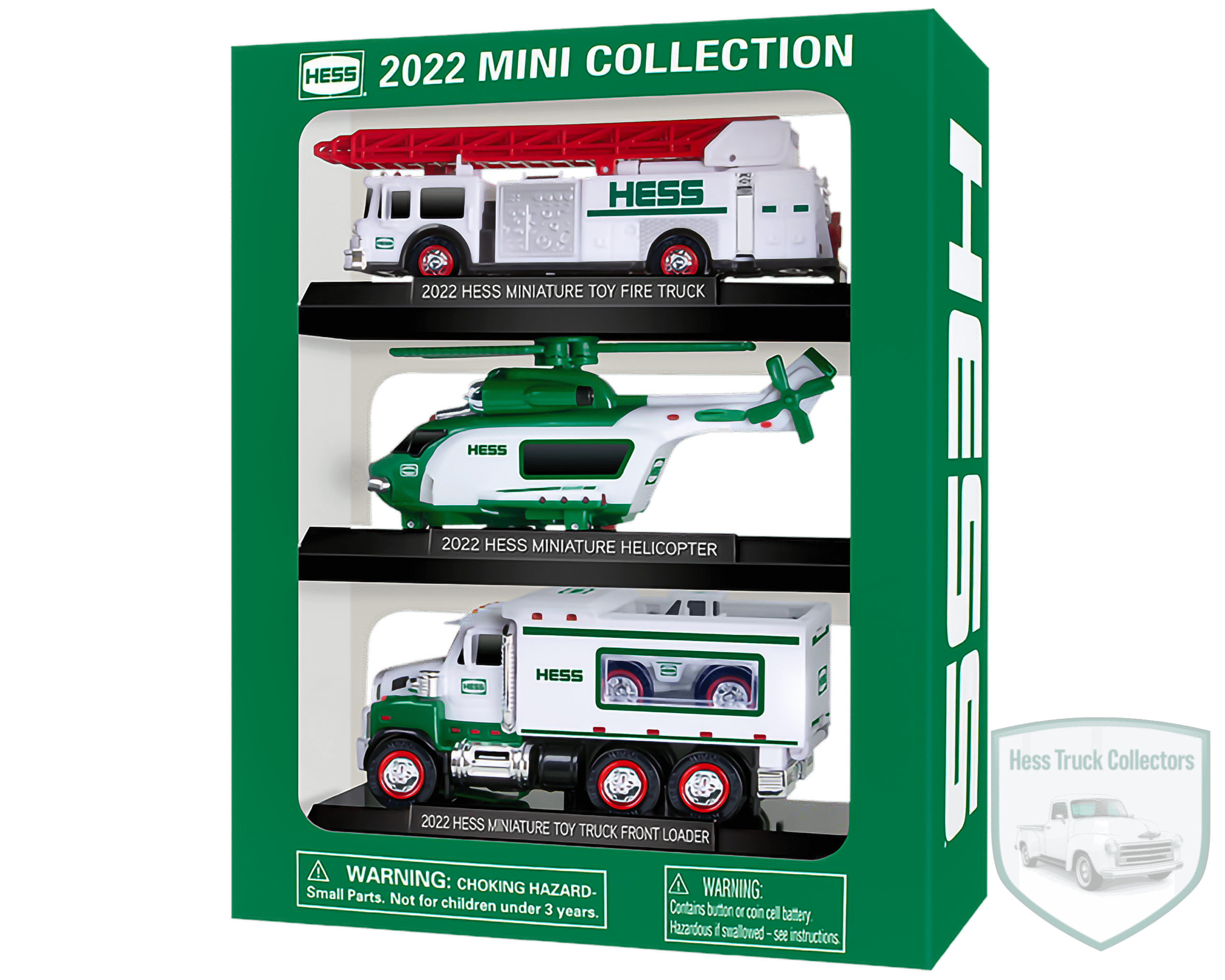The 2022 Hess Mini Collection continued the trend of three-in-one multi-packs, offering miniature scale reproductions of beloved full-size holiday toys. This set focused on a mix of heavy equipment, emergency, and aviation themes from different decades.