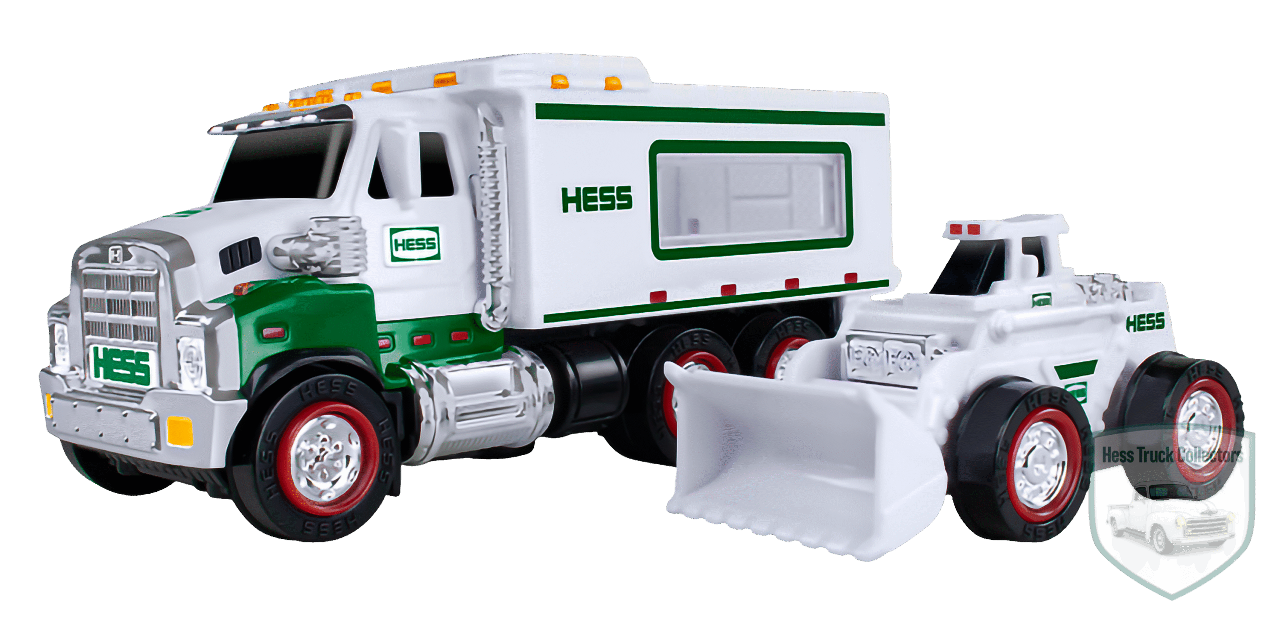 | Miniature Truck and Front Loader | 2008 Hess Toy Truck and Front End Loader | This 2-in-1 set includes a truck with an open-box bed and a removable Loader. The Loader features a fixed-position front bucket. Both vehicles have working lights. |